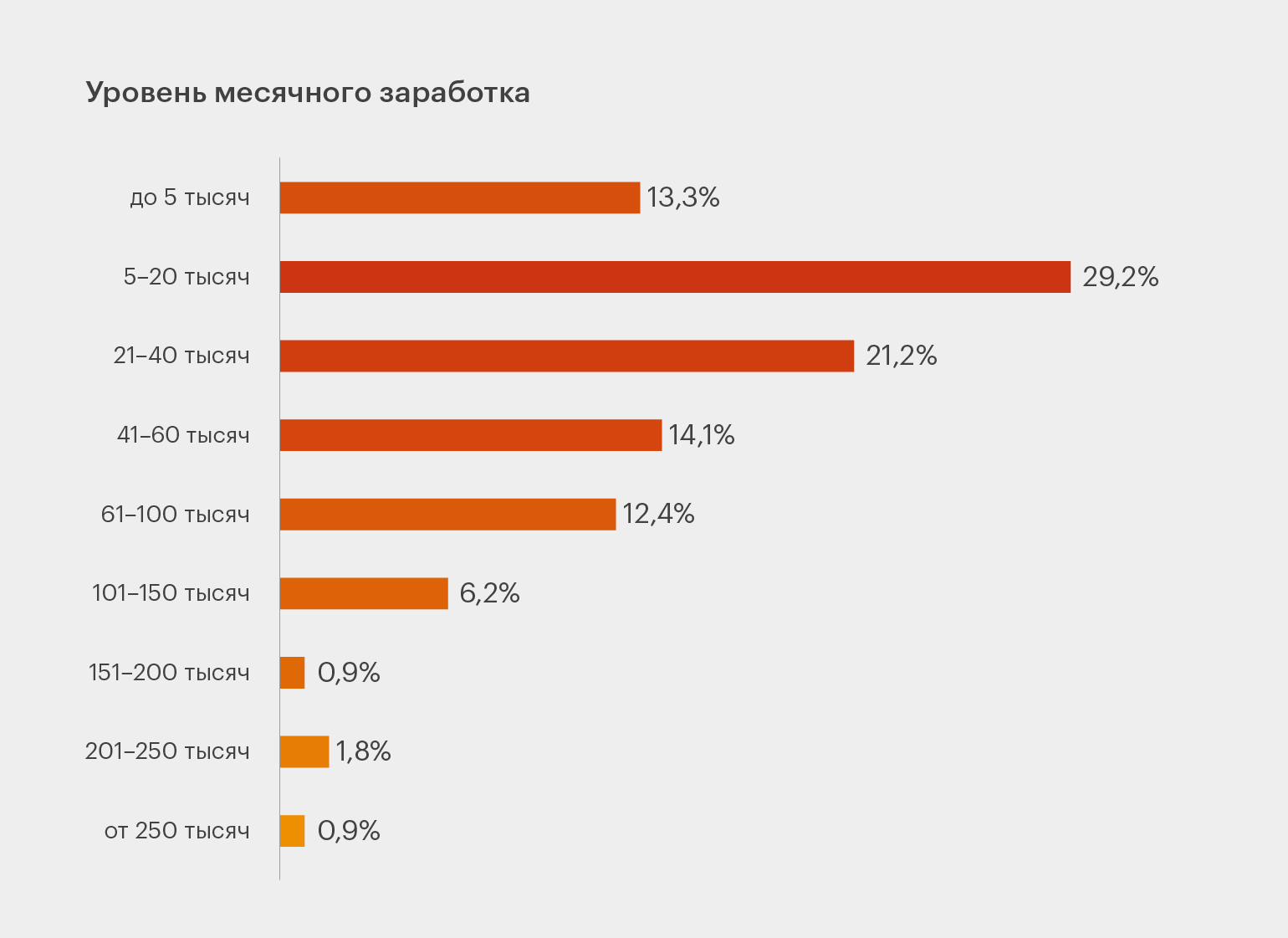 Сколько платят? Зависит от навыков. На бирже есть заказы по 5–10 рублей за 1000 знаков текста. Прямые клиенты могут платить 15–20 тысяч рублей за текст. По данным опроса «Текстодрома», средний доход 29,2% копирайтеров — 5–20 тысяч рублей в месяц, ещё 21,2% зарабатывают 21–40 тысяч ежемесячно.