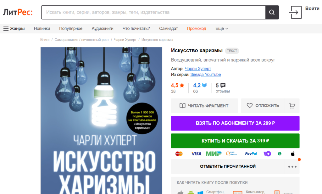 Описание книги: есть ли у вас харизма и можно ли ее развить? Чарли Хуперт — автор популярного YouTube-канала Charisma on Command, на его официальный русскоязычный канал «Искусство харизмы» подписано более 1,6 миллиона человек. В своей книге Чарли раскрывает секреты личного магнетизма самых харизматичных людей мира — Билла Клинтона, Уилла Смита, Стива Джобса и многих других.
