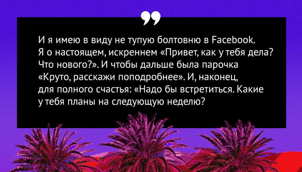 «И я имею в виду не тупую болтовню в Facebook. Я о настоящем, искреннем «Привет, как у тебя дела? Что нового?». И чтобы дальше была парочка «Круто, расскажи поподробнее». И, наконец, для полного счастья: «Надо бы встретиться. Какие у тебя планы на следующую неделю?» — пишет Марк.