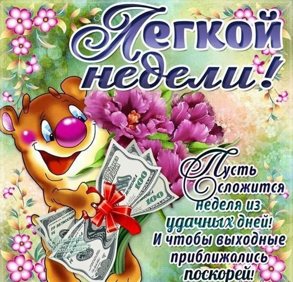 Пусть эта неделя принесет вам удачу,И каждый день будет интересным и ярким,Чтобы труд был не только работой,Но и настоящим удовольствием.