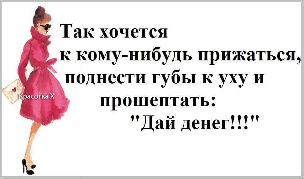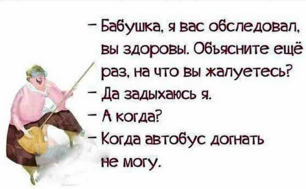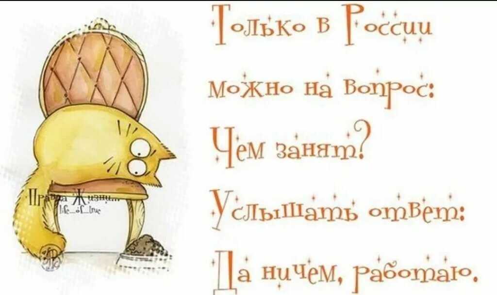 Тебе грустно? Вспомни осьминога. И ноги из ушей, И руки из жопы, и жопа с ушами, и голова в жопе. И не жалуется….Знаете ли вы, что на детских кубиках буквы “у”, “х” и “й” находятся всегда на одном кубике. На всякий случай…Утро.Работа. Начальник спрашивает: – у тебя глаза красные. Пила, что ли? -нет! По работе скучала, плакала!Я все никак не могу начать качать пресс. Не могу выбрать подходящее время: то есть пора, то только поел.Как же мне надоела кухня… Хочу прийти в магазин и купить 2 мешка по 10 кг… “Корм мужской сбалансированный, для крупных пород”:-))))Все неприятности случились… Теперь приятности попрут…Финальная стадия недосыпания-это когда тебе снится, как ты спишь.Настоящая любовь только у собак! К примеру, если закрыть на 5 часов в гараже жену и собаку, то когда вы откроете гараж, вас с радостью встретит только собака.Купила мелок от тараканов, теперь в голове тихо и спокойно… сидят, рисуют.Когда меня просят быть фотогеничным.Один вопрос: -Где взять такой костюм?Бабуля успокоила: “Подумаешь прыщики у нее на лице. У некоторых они вон, вместо сисек…”Когда решил просушить свои орешки: -Интересно, почему он мне не звонит?Нет настроения – съешь шоколадку! Не помогает- запей коньяком!Одна маленькая девочка, когда у нее было плохое настроение, входила в комнату со словами: -Никому не здрасьте!