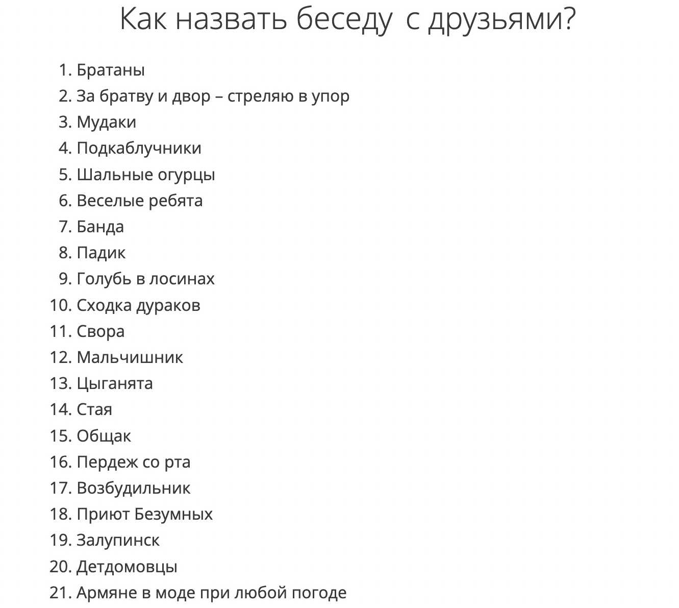 Простые и распространенные названия, такие как «Разговор» или «Беседа», не подойдут. Участникам будет неинтересно. Если вы хотите увлечь их и подарить им массу эмоций, вам нужно знать, как назвать беседу в VK интересно и оригинально.
