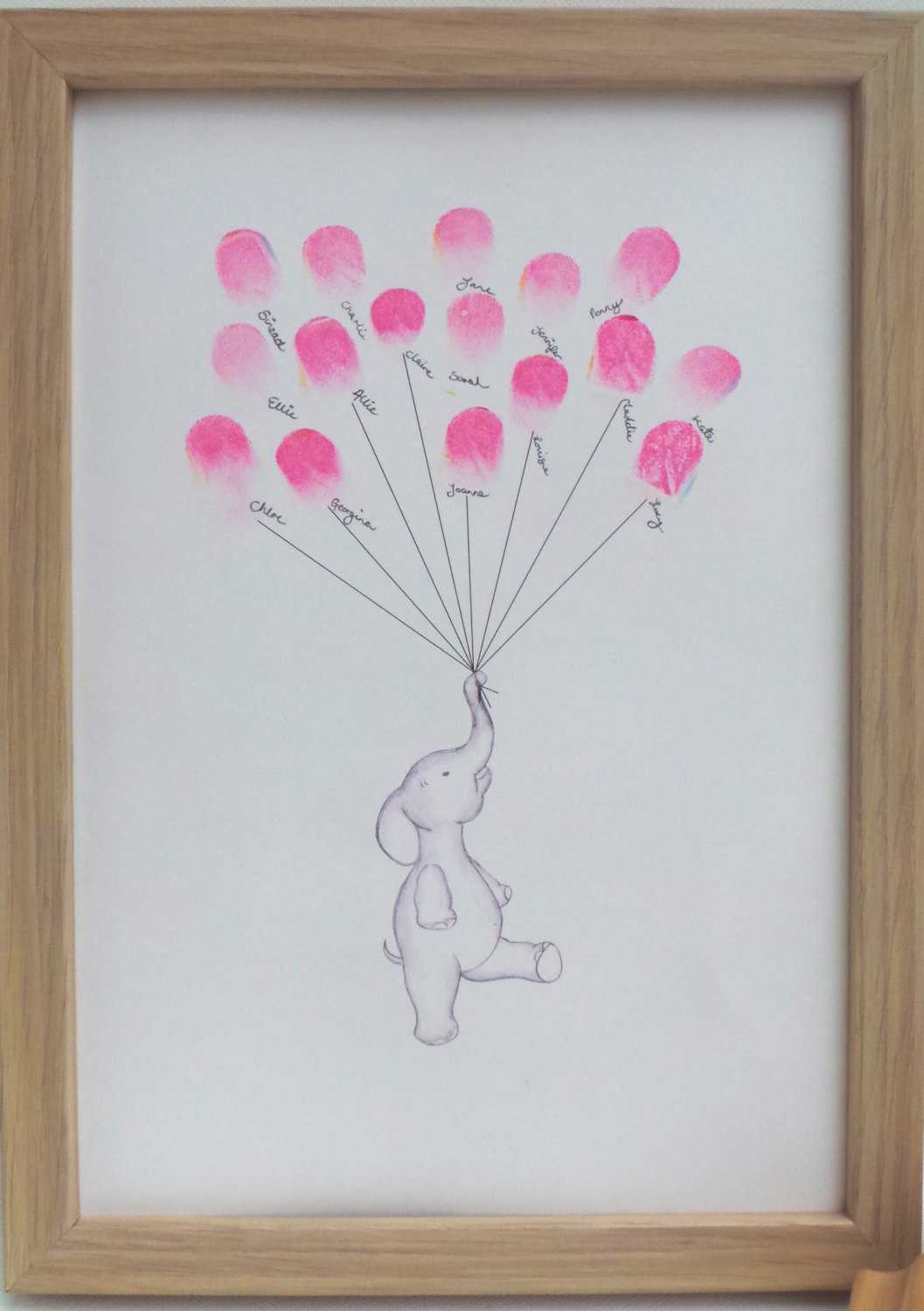 Возьмите для рисования в этом стиле любое животное, интересный предмет или, как самый доступный способ, пальцы всех гостей. Попросите их подписать отпечаток, затем соедините линиями. Краска может быть любого цвета. Вставьте в рамку.