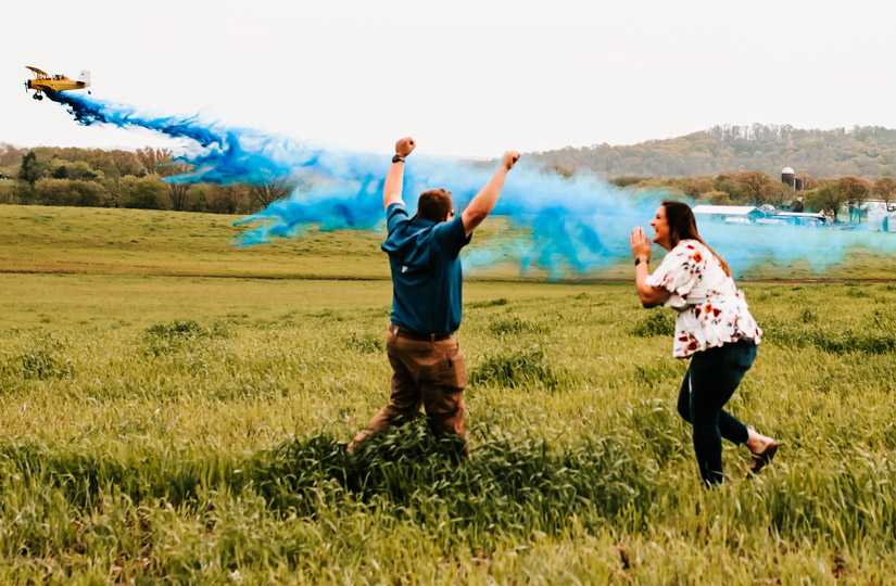 - Если женщина выходит замуж уже в положении, пол ребенка можно объявить сразу на празднике. Креативный способ — на аэродроме. Необходимо арендовать спортивный самолет с дымовым шоу. Стоимость такого удовольствия высокая, поэтому стоит пригласить фотографа, чтобы снять необычное шоу.