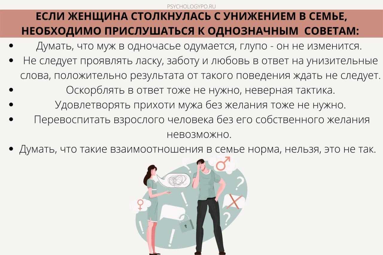 - Вы сами провоцируете мужа унижать вас. Отбрасывать это причину не стоит. Нередко женщины сами выводят мужчин, а потом ходят в недоумении, не понимая, что они такого сделали. Быть может, вы «пилите» своего супруга и сами, пусть ненамеренно, унижаете его. Проанализируйте своё поведение, чтобы разобраться в ситуации. Если вы каким-то образом гнобите мужа, то его защитная реакция — в ответ гнобить вас.