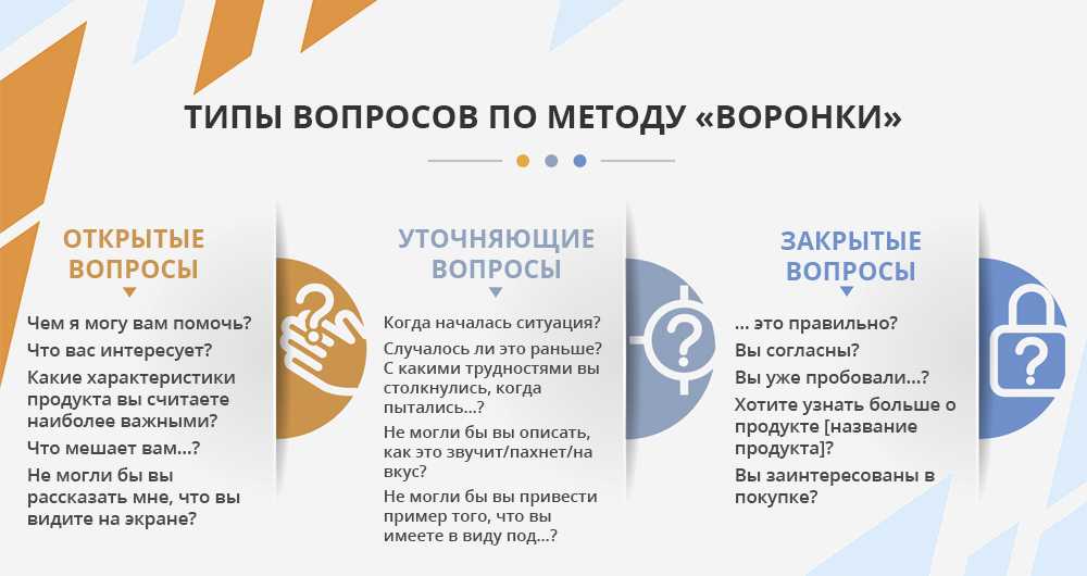 В зависимости от ситуации и потребностей хорошо работают разные формы вопросов. Вопросы можно разделить на несколько типов: