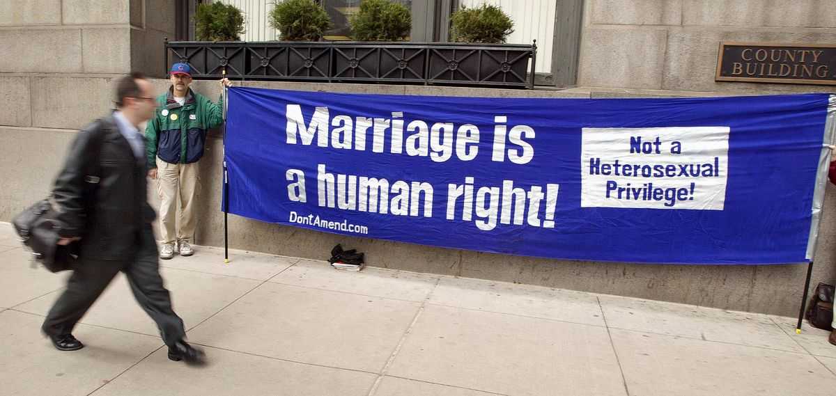 Баннер «Брак — это человеческое право, а не гетеросексуальная привилегия» в поддержку однополых браков перед зданием мэрии в Чикаго, 2 марта 2004 г.