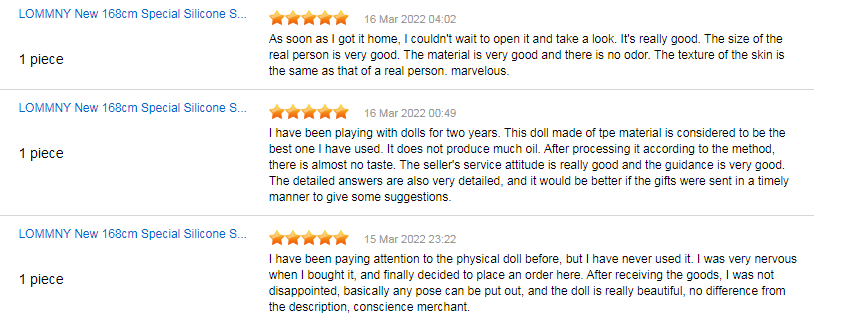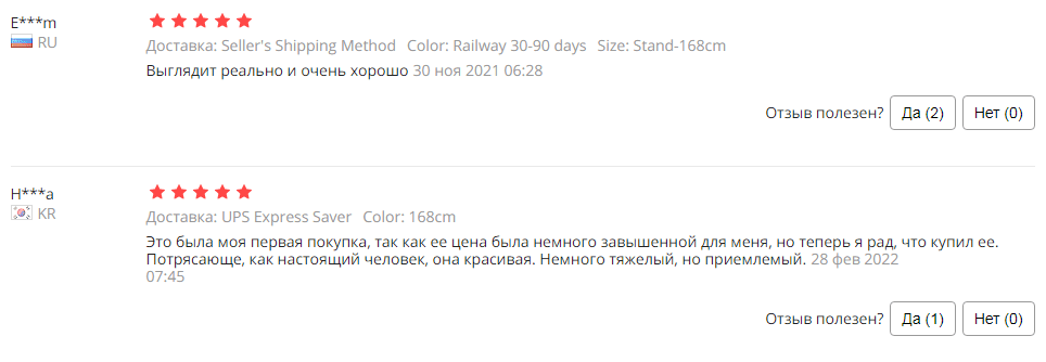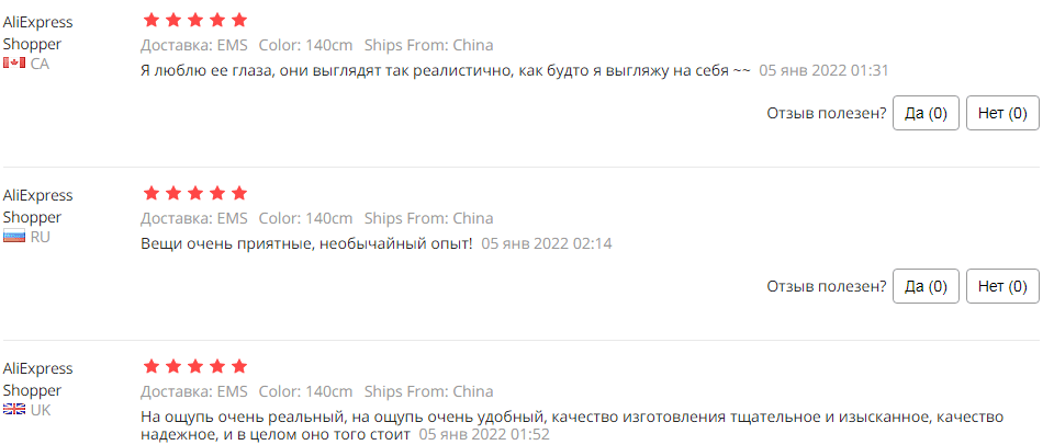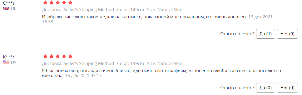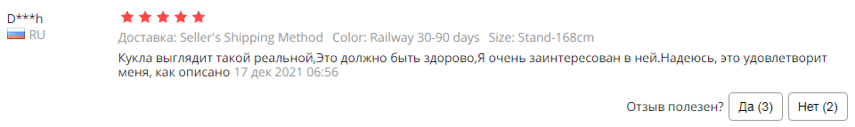 Реальные отзывы: по мнению мужчин, кукла очень приятна на ощупь, реалистична. Отмечают изысканный внешний вид, сдержанный макияж, красивые выразительные глаза. С сайта Алиэкспресс:
