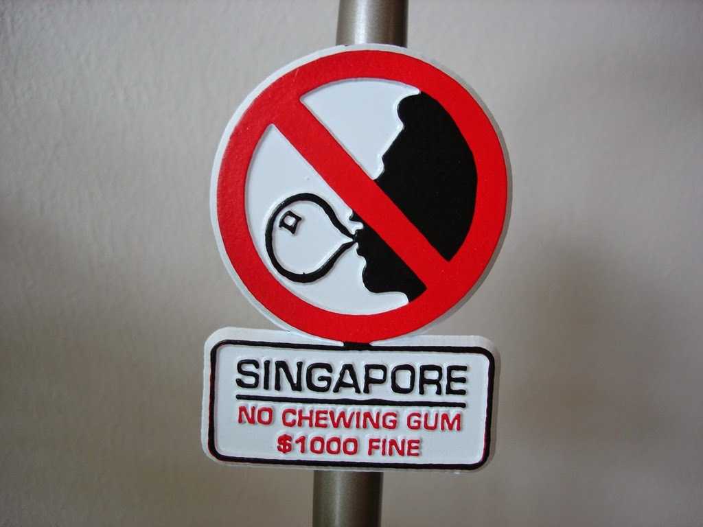 В Сингапуре нельзя жевать жвачку. Ее ввоз в страну и употребление на публике заставит туриста расстаться с 500 SGD. Исключением является только медицинское предписание. Как, например, жвачка от никотиновой зависимости. Почему нельзя жевать жвачку в Сингапуре? Этот запрет начал действовать с 2004 года. Причина проста, на уборку жвачек, прилепленных где-нибудь под креслом общественного транспорта, под лавочкой в парке и многих других местах необходимо тратить значительные средства. Речь идет как про финансовый, так и про человеческий ресурс.