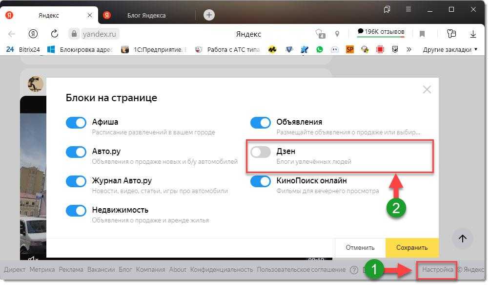 - Переведите бегунок в неактивное положение напротив строки «Дзен. Блоги увлеченных людей», а затем щелкните «Сохранить».