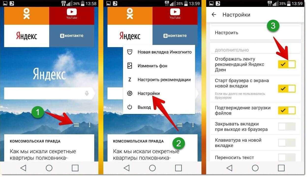На главной странице Яндекса в своем одноименном браузере лента Дзена будет появляться независимо от ваших настроек на десктопе. Поэтому здесь вам также нужно будет отключить Дзен через настройки. Это инструкция подойдет и для гаджетов на базе Android, и для устройств от Apple, поскольку интерфейс мобильного приложения Яндекс и там, и там практически идентичен.