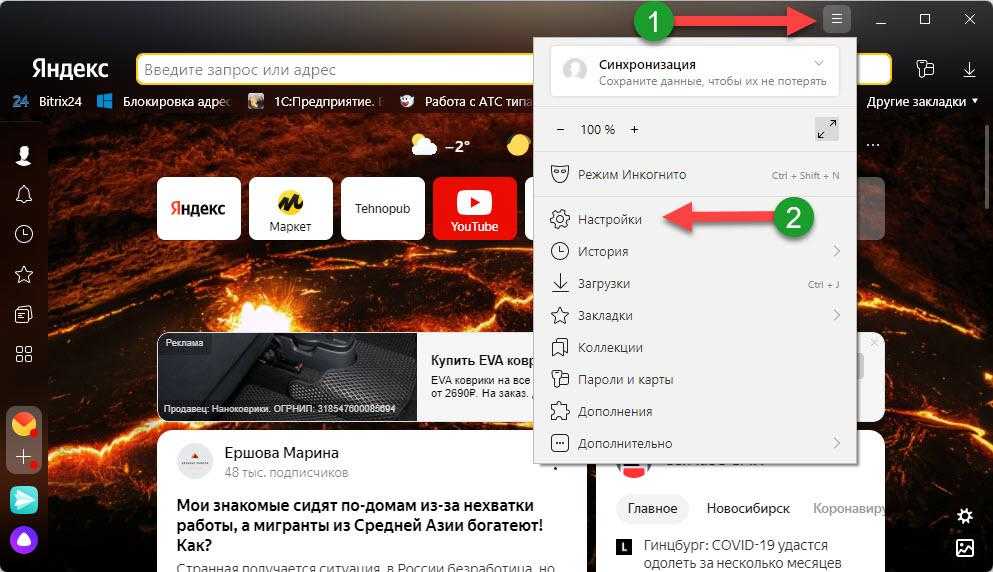 - Открыть веб-обозреватель и зайти в настройки, кликнув по надписи.