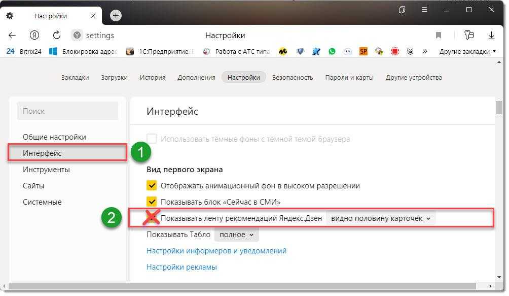 Настройки Дзена в Яндекс Брайзере на десктопе