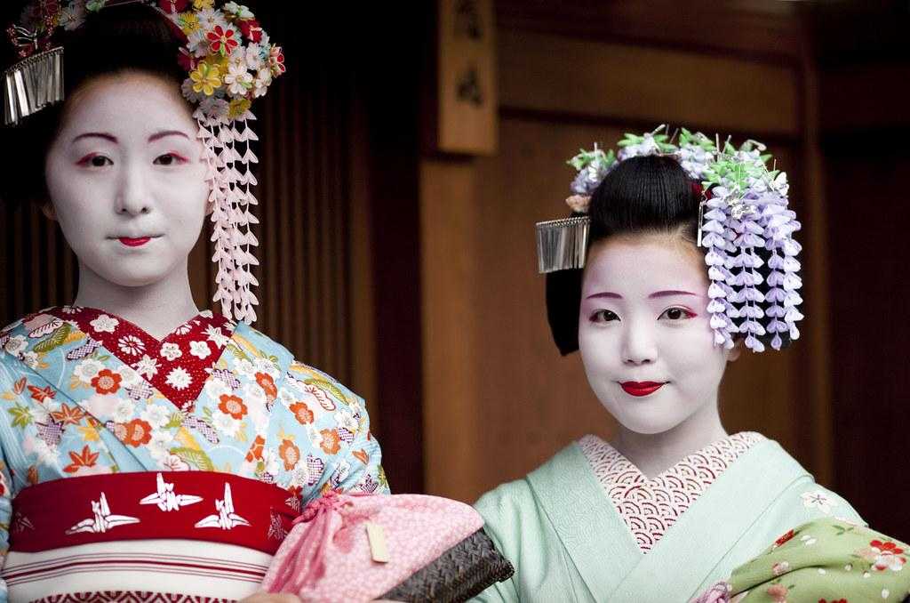 Длительное время (4-5 часов) требует ношения кимоно, застегивания пояса, нанесения белого и макияжа. В одиночку это сделать невозможно. Они одеты в одежду студентов или старших сестер. Они производят магию на лице, плечах и шее. Главное — во всем соблюдать меру и ничего не перепутать. Не стоит случайно закрывать под прической чистый участок на шее. Сзади кимоно завязан замысловатый узел пояса, закрывающего кимоно. Небрежно завязанный пояс на груди говорит о доступности.