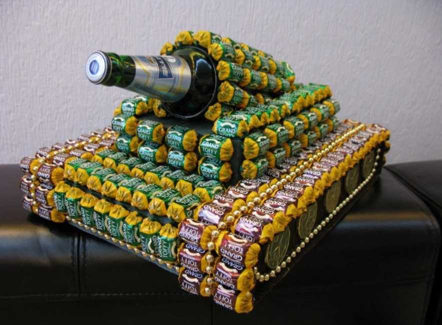 - Соберите из нескольких банок пива и закуски к нему символичный танк – это будет тематический презент.