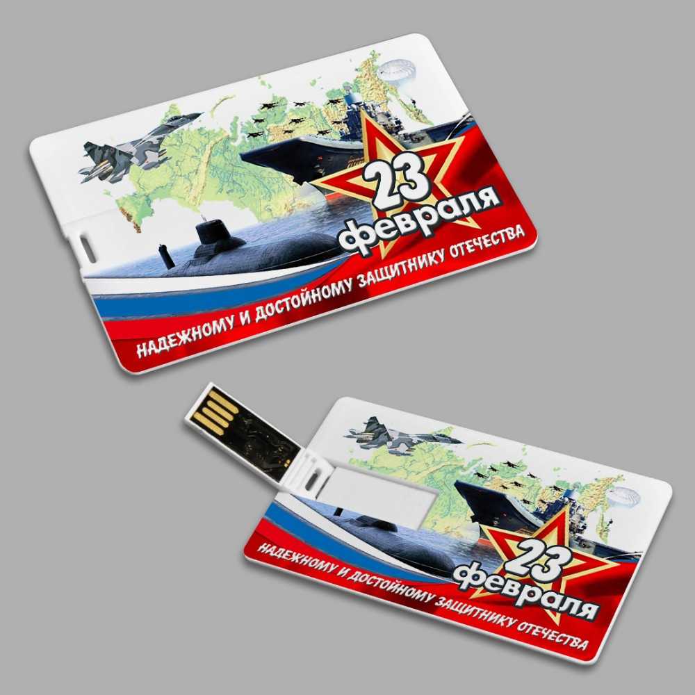 Флешка – всегда нужный предмет в офисе, а эта, сделанная в военной тематике праздника будет еще и напоминать о факте подарка