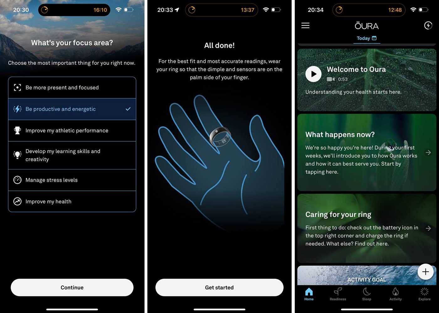 При первом запуске вы потратите примерно 10 минут на первичную настройку кольца и создание аккаунта Oura. Если пользуетесь iPhone, приложение предложит автоматически «подтянуть» ваши основные данные из встроенного приложения Здоровье.
