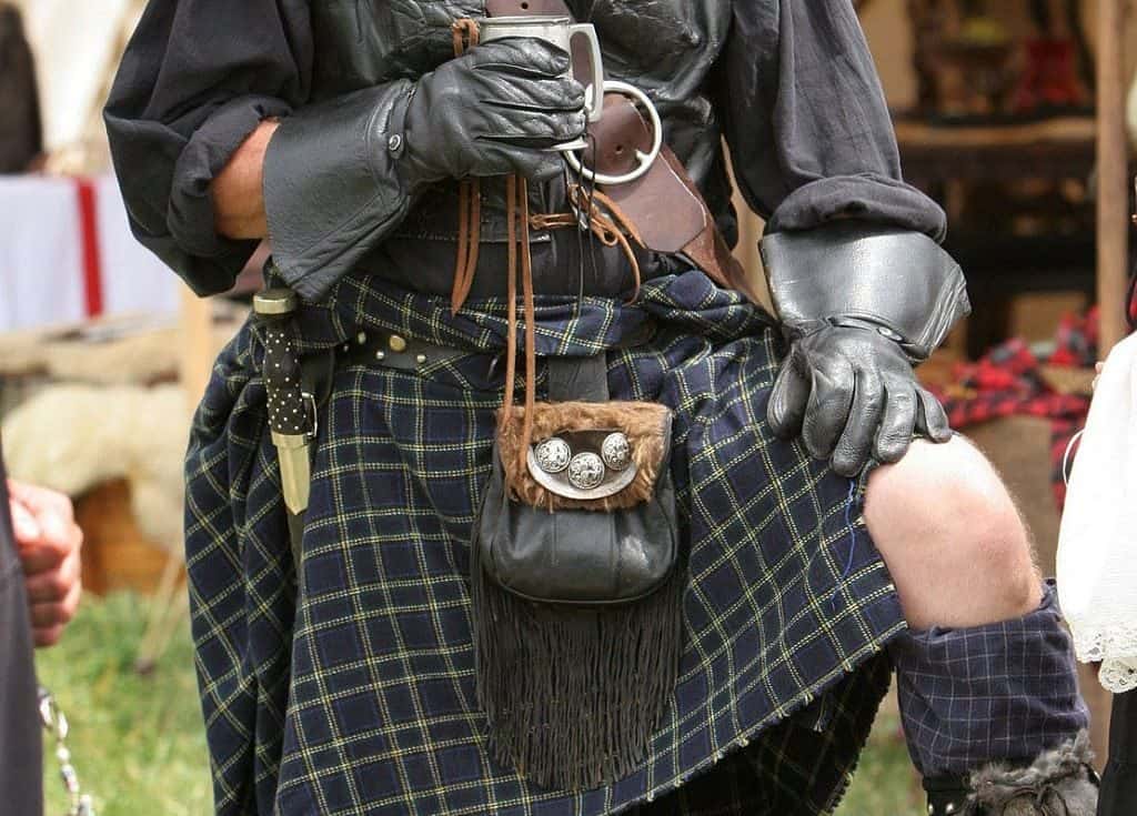 Шотландский килт обычно носят с высокими шерстяными носками до колена, часто с подвязками, и кожаной сумкой с мехом, которая висит на ремешке или цепи, обернутой вокруг талии. Это может быть простая или тисненая кожа, украшенная мехом или металлической обшивкой.