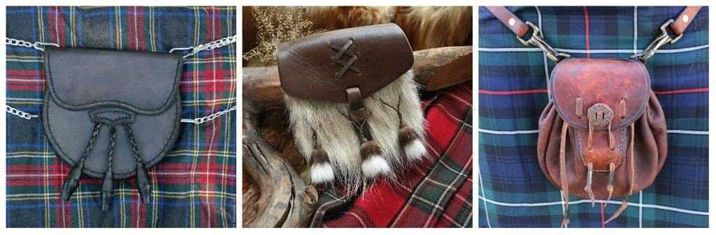 На килте не предусмотрены карманы – вместо них есть специальные сумки-кошельки, где можно хранить деньги, спиртное, различные предметы мужского обихода. Называются такие сумки – спорраны. Они бывают кожаные, меховые, из конского волоса, носят их спереди чуть ниже ремня, прикрепляя ремешками или цепочками.