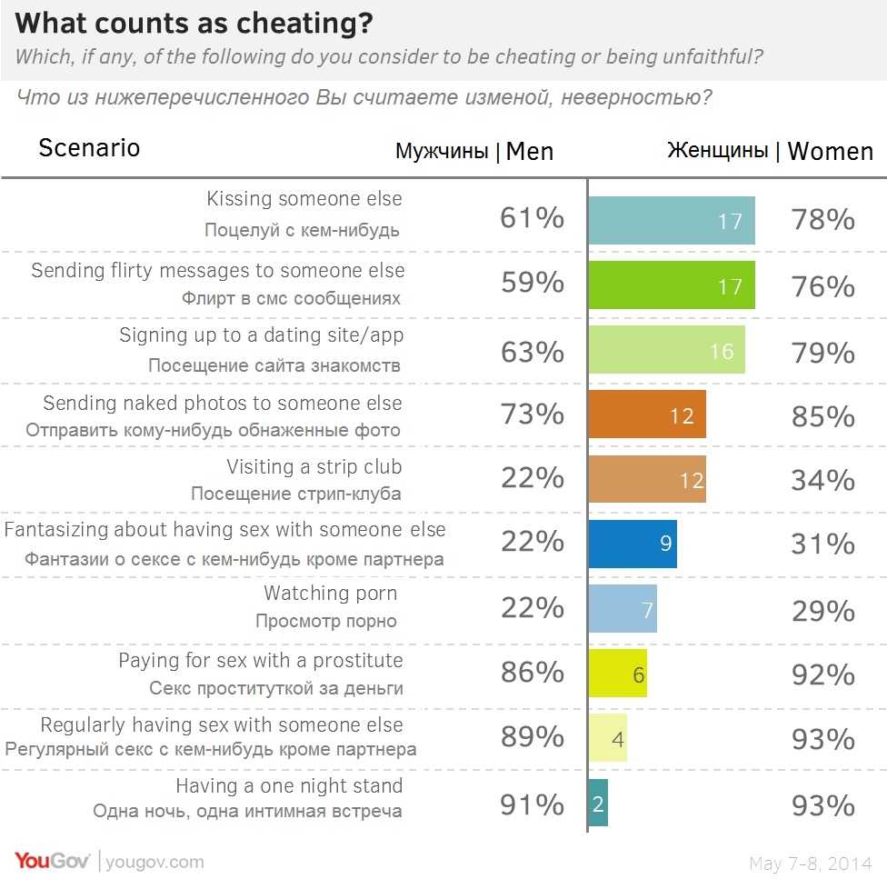 Что считать изменой часто зависит от индивидуальных убеждений и взглядов. А также от пола: мужчины и женщины по-разному относятся к изменам. Представительницы прекрасного пола включают в это понятие больше поступков, чем мужчины.