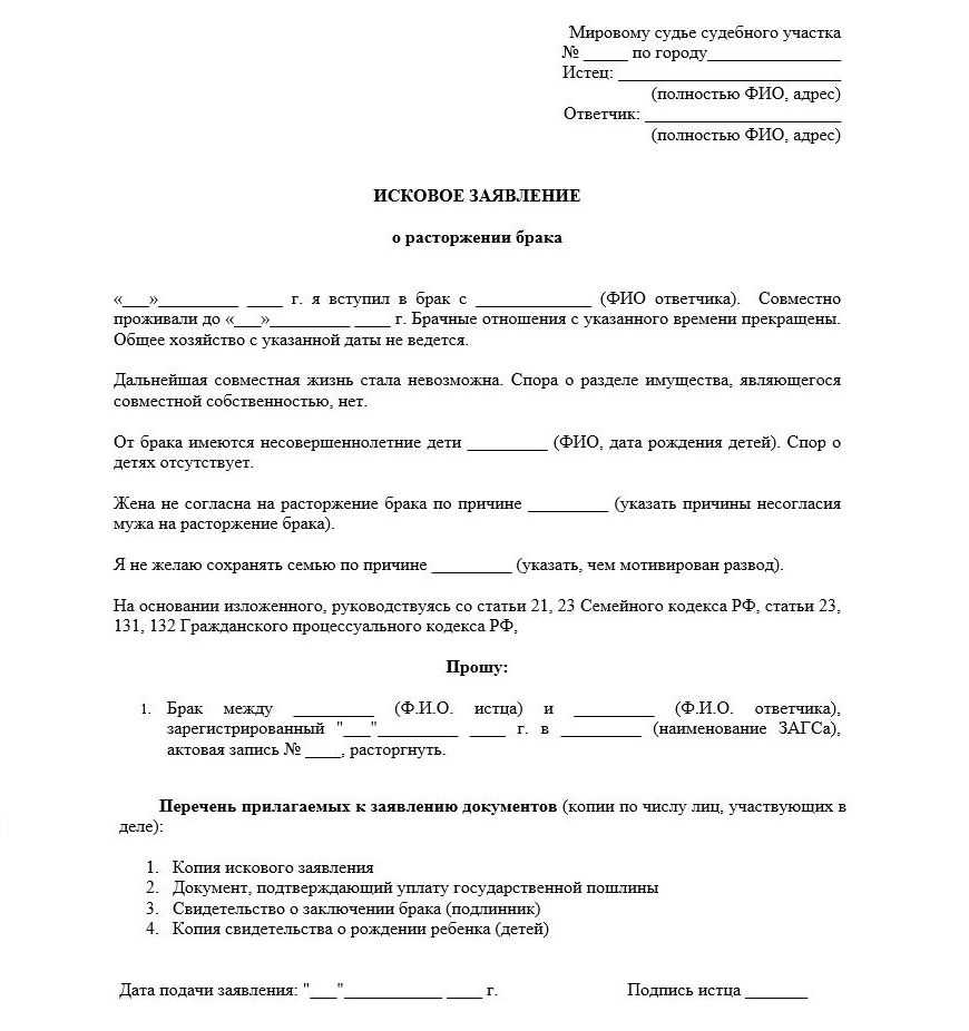 Пример заявления о разводе: