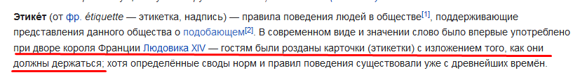 А этикет — это правила поведения, которое должен соблюдать интеллигент общаясь с верхушкой. Элита не соблюдала этих правил. Вы себе можете представить чтобы султан, царь, император соблюдали этикет обычных людей, я лично нет. Потому что этикет был придуман не для сильных мира сего, а для тех, кто с ними общается.