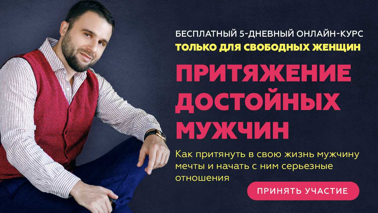 Если у вас есть трудности в отношениях с мужчинами, обязательно приходите на бесплатный 5-дневный онлайн-курс «Притяжение достойных мужчин: как притянуть в свою жизнь мужчину мечты и начать с ним серьезные отношения».