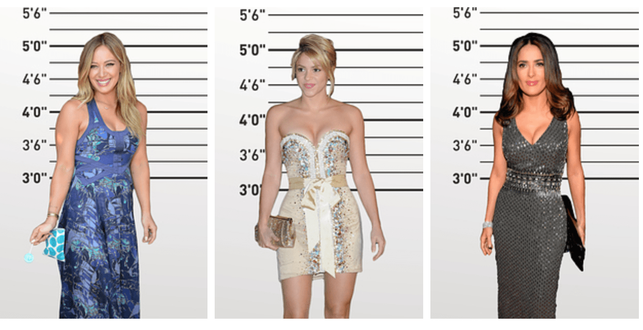 Эдит Пиаф 147 см, Шакира 150 см, Кайли Миноуг 153 см, Юлия Волкова 154 см, Леди Гага 155 см, Кристина Агилера 156 см, Джиллиан Андерсон 157 см, Ева Лонгория Паркер 157 см, Светлана Светикова 157 см, Сальма Хайек 157 см, Элизабет Тейлор 157 см, Юлия Савичева 159 см, Сара Джессика Паркер 160 см, Скарлетт Йоханссон 160 см.