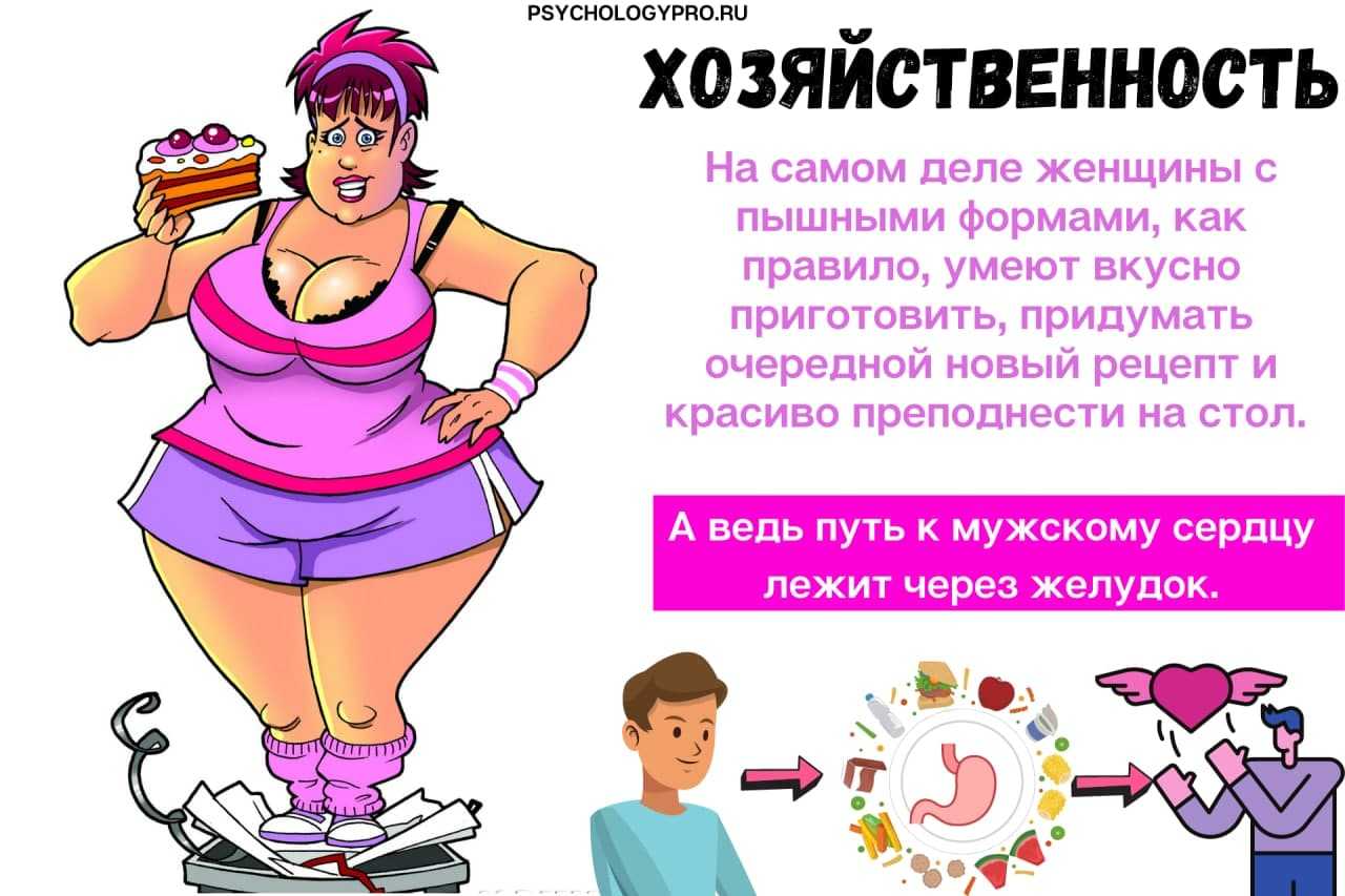 На самом деле женщины с пышными формами, как правило, умеют вкусно приготовить, придумать очередной новый рецепт и красиво преподнести на стол. А ведь путь к мужскому сердцу лежит через желудок.